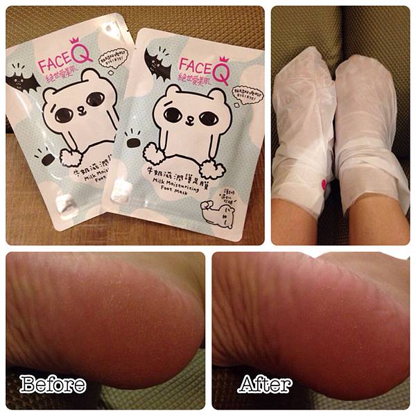 敷之前我有先我泡了個腳又磨了腳後跟,接著就使用腳膜。敷腳膜就像穿襪子一樣,而精華液就完全包覆著腳底板。大約敷了20分鐘後我脫下腳膜,再稍微按摩一下讓精華液再被吸收後我就拿熱毛巾把腳擦乾。我的腳後跟有明顯的變嫩,粗糙角質有變少,但應該還需要再敷幾次且搭配腳乳液才會讓腳底板完全變嫩。