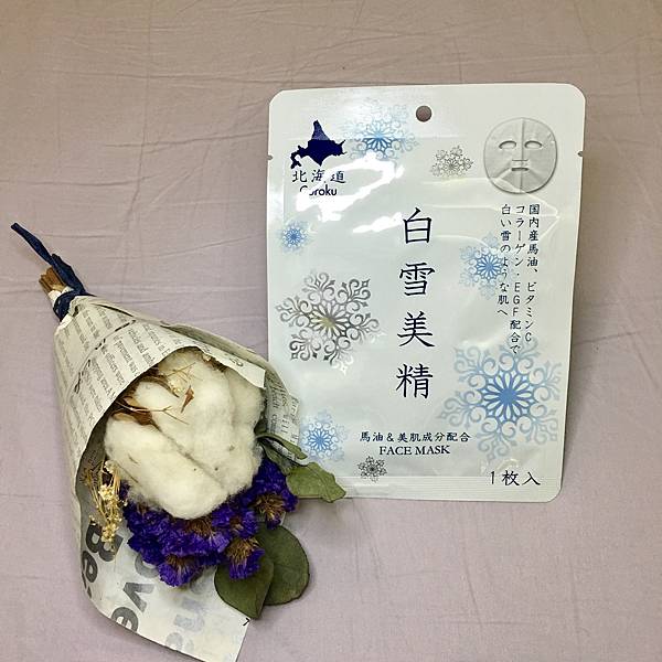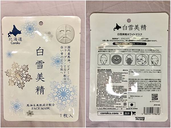 後來我上網查了一下,這款面膜是2016年北海道的人氣商品,其品牌不只有出面膜、護唇膏,乳液、肥皂、洗髮精也都有出,你也知道馬油是北海道三寶之一(其他兩寶別問我),所以我想這款馬油應該會比之前我敷過的3D立體馬油面膜、黃金馬油面膜、我的美麗日記馬油面膜來的更厲害,因為白雪美精馬油面膜是來自北海道的!